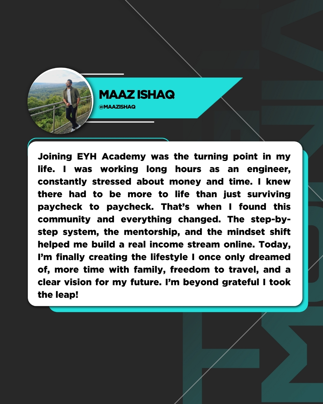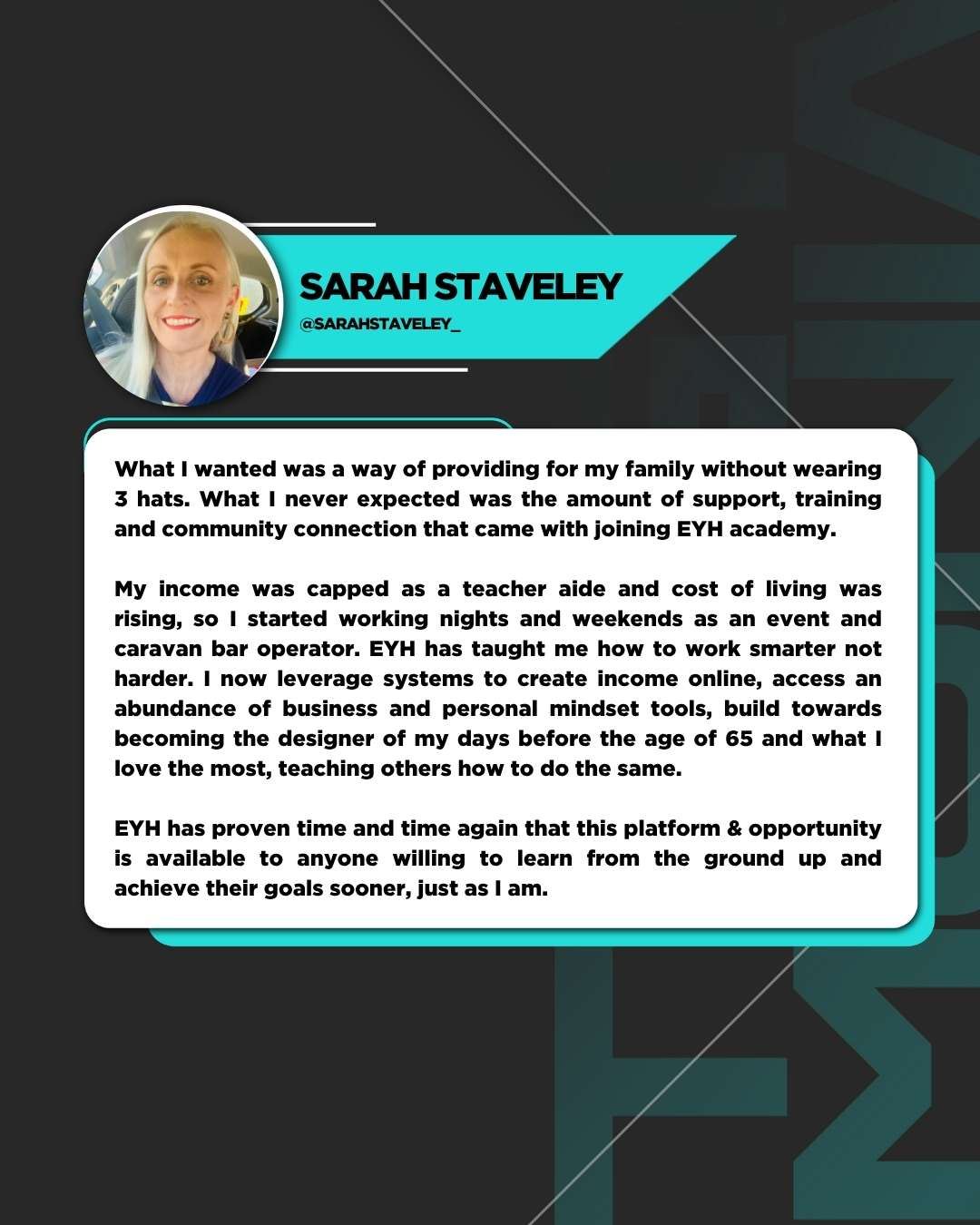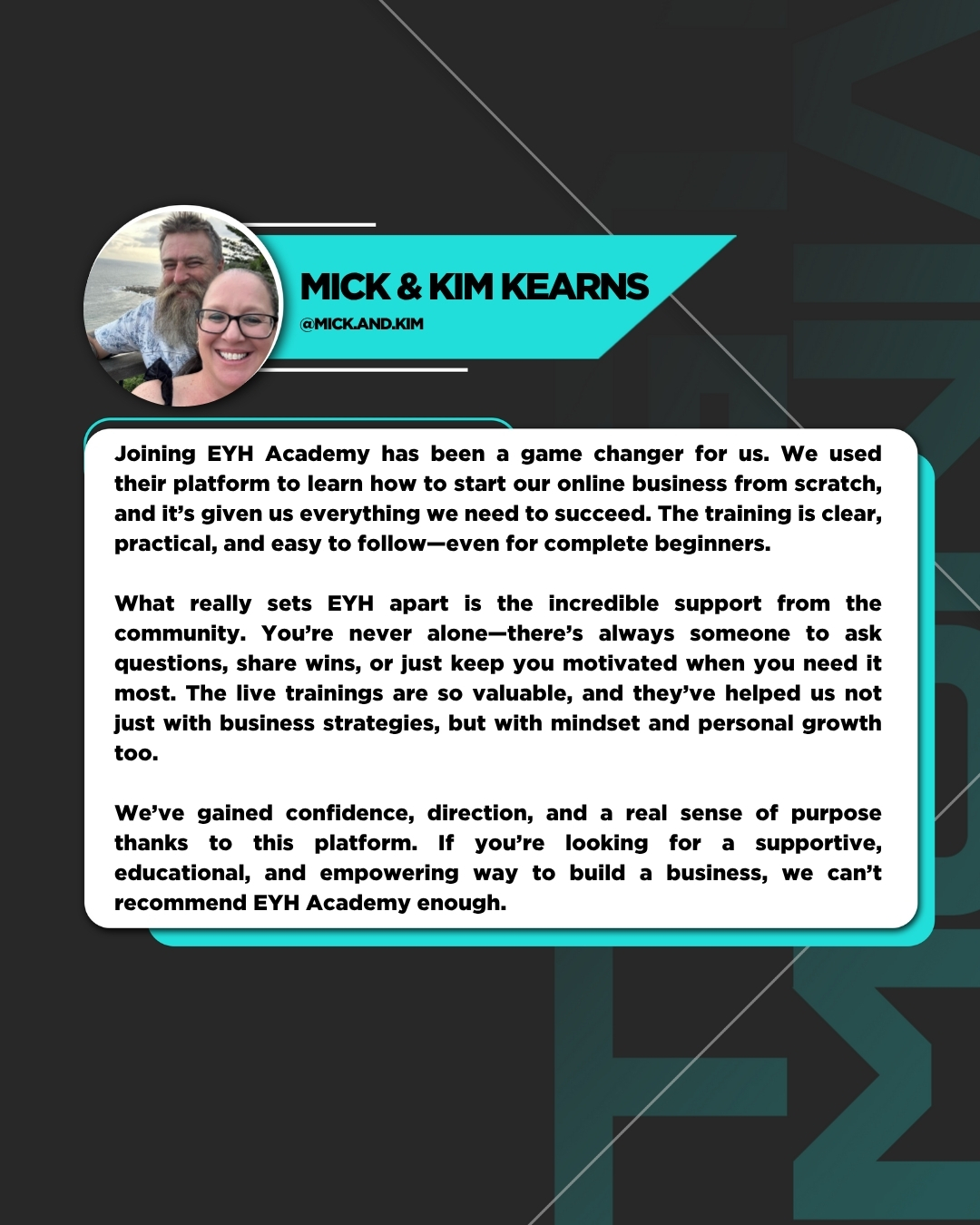 Expand Your Horizons Academy (EYH) is designed to help you create a business that aligns with your values and lifestyle while giving you the skills and support to succeed. Our platform provides everything you need to build a powerful online brand and grow a thriving business through social commerce.